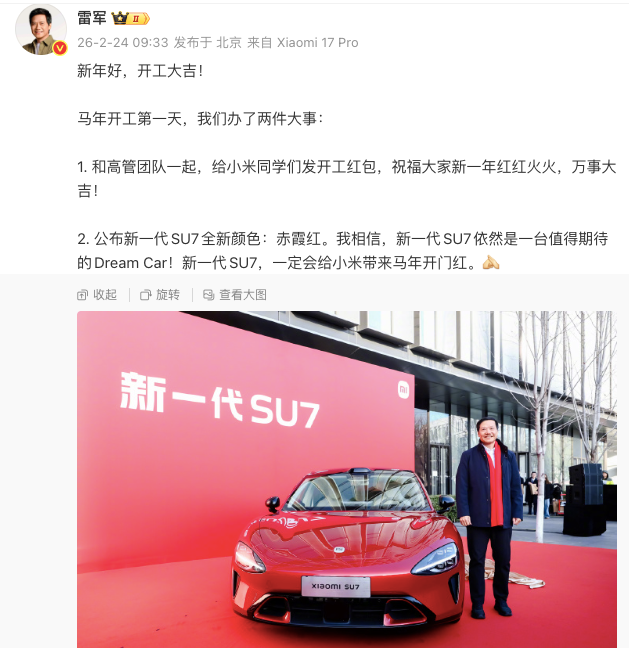 2月24日消息,今日正月初八,小米创办人,董事长兼CEO雷军给小米同学们发开工红包,并公布新一代SU7全新颜色:赤霞红。