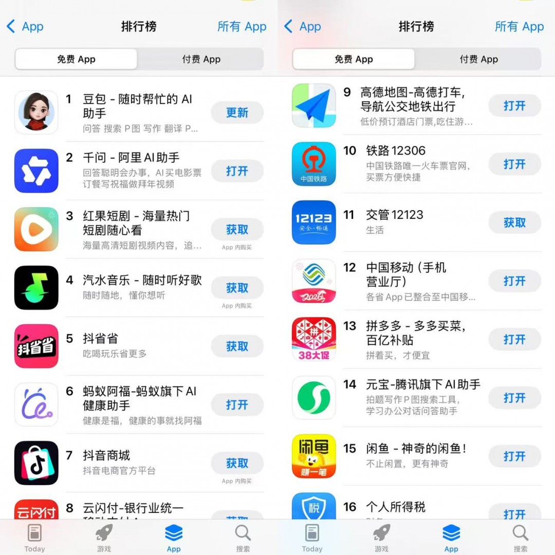 这两天,不少用户反映,“红包大战结束后,下载的应用已经卸载的差不多了”。也有用户表示,“还在用,给小孩检查作业挺好的”。截至发稿,苹果应用商店免费APP排行榜TOP 10中,豆包位列第一,千问第二,蚂蚁阿福第六,元宝已经跌至第14名。