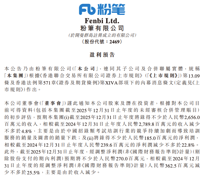 2月25日消息,在线职业教育培训公司粉笔有限公司(股份代号:2469)发布盈利预告,披露截至2025年12月31日止年度的未经审核初步财务估算。