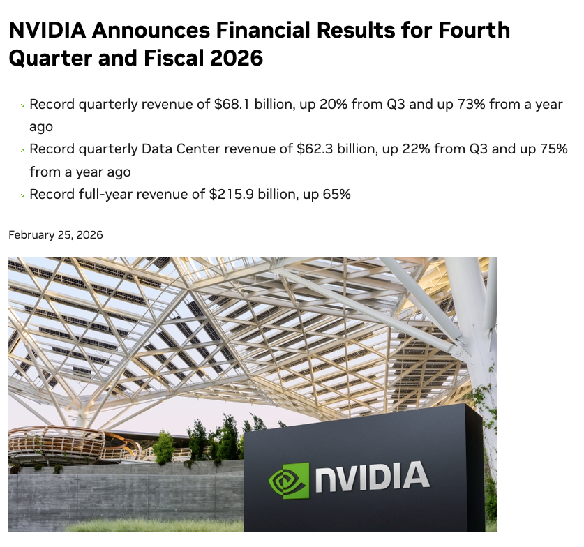 2月26日消息,全球AI芯片领导者英伟达公布了截至2026年1月25日的2026财年第四季度及全年财报。这份备受市场瞩目的“成绩单”不仅各项数据远超预期,更以其强劲的业绩指引缓解了近期弥漫市场的“AI泡沫”担忧。
