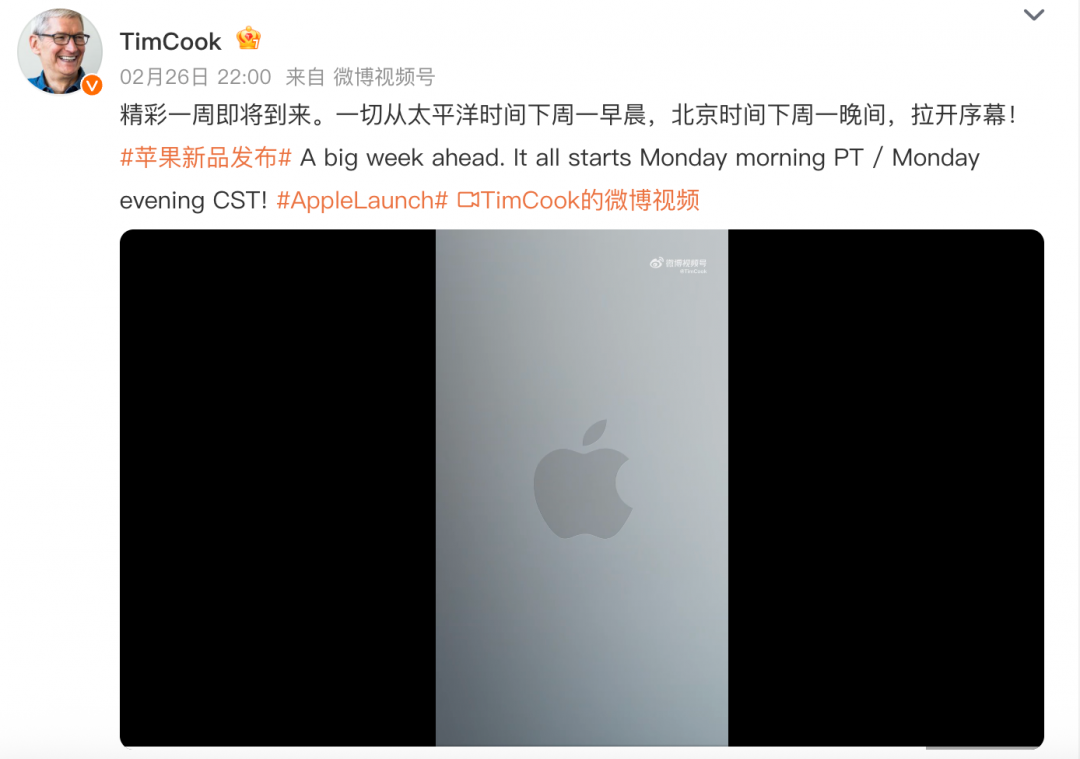 2月27日消息,昨日晚间,苹果公司CEO库克在微博发文,称“精彩一周即将到来。一切从太平洋时间下周一早晨,北京时间下周一晚间,拉开序幕。”并加上了“苹果新品发布”的标签。