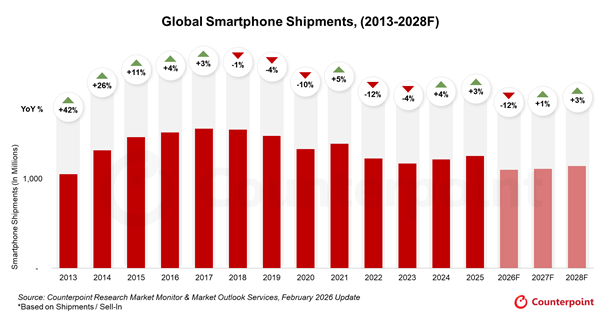 2月28日消息,市场研究机构Counterpoint Research发布最新报告指出,受内存供应危机持续加剧影响,2026年全球智能手机出货量将迎来历史最严重跌幅,同比下滑12.4%至11亿部以下,创2013年以来的最低纪录。