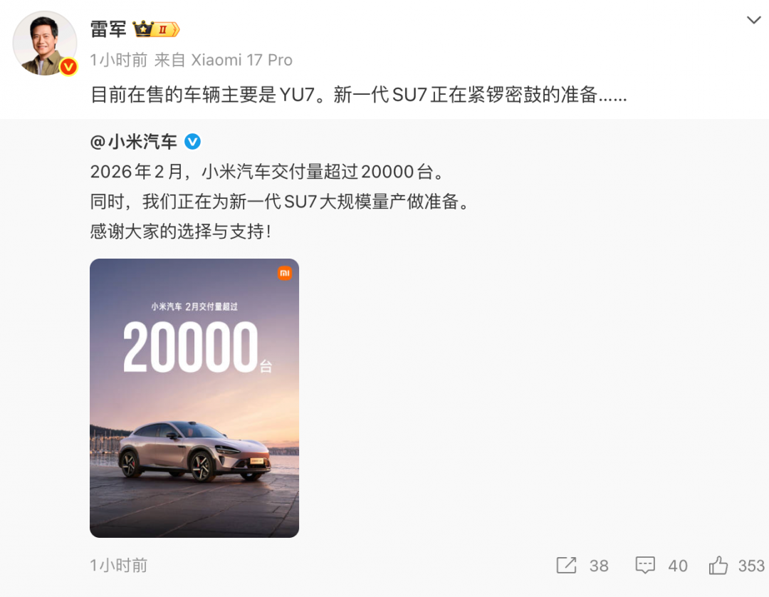 小米创办人,董事长兼CEO雷军随即转发上述微博并表示:目前在售的车辆主要是YU7。新一代SU7正在紧锣密鼓的准备……