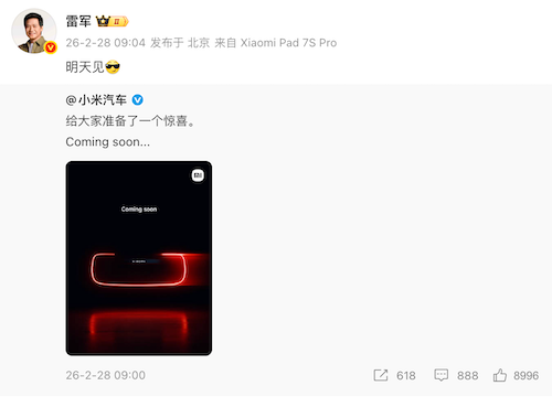 此前,小米汽车官方微博发布新车预告海报,配文 “给大家准备了一个惊喜。Coming soon...”。小米集团创始人、董事长兼 CEO 雷军同步转发,明确预告 “明天见”。此番正式揭秘。