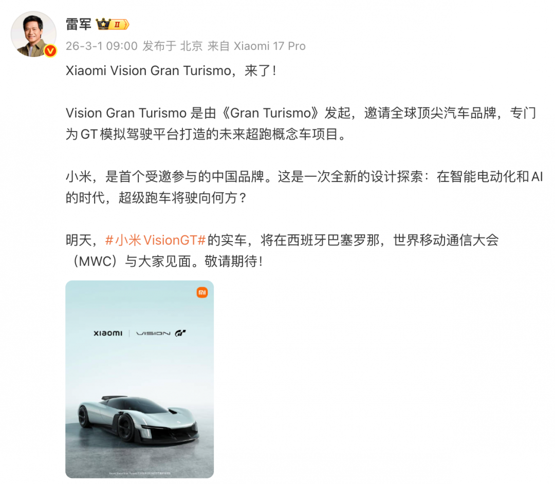 刚刚,雷军在微博正式宣布,明天,#小米VisionGT#的实车,将在西班牙巴塞罗那,世界移动通信大会(MWC)与大家见面。