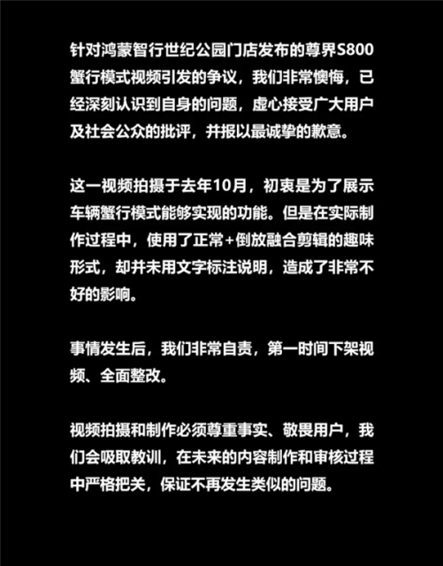 因加速、倒放宣传视频引发争议 两家鸿蒙智行用户中心公开致歉