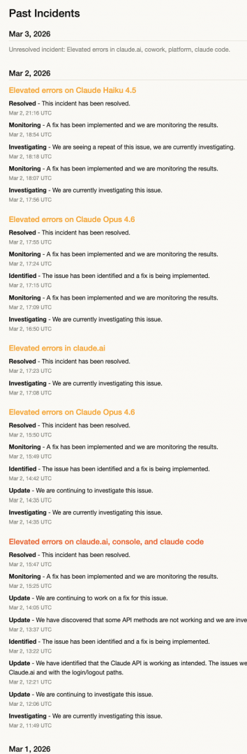 然而,好景不长,就在Claude登上榜首的第二天,3月2日至3月3日,一场持续10小时的连环故障,让所有涌入门前的用户反复吃了闭门羹。