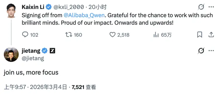 对同日离职的Qwen团队成员Kaixin Li,唐杰直接回复:“join us, more focus”(加入我们,更专注)