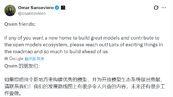 今天,谷歌DeepMind开发团队相关负责人Omar Sanseviero也在x平台公开喊话Qwen 的朋友道:“如果您想找个新地方来构建优秀的模型,并为开放模型生态系统做出贡献,请联系我们,我们的发展路线图上有很多令人兴奋的内容,未来还有很多工作要做。”