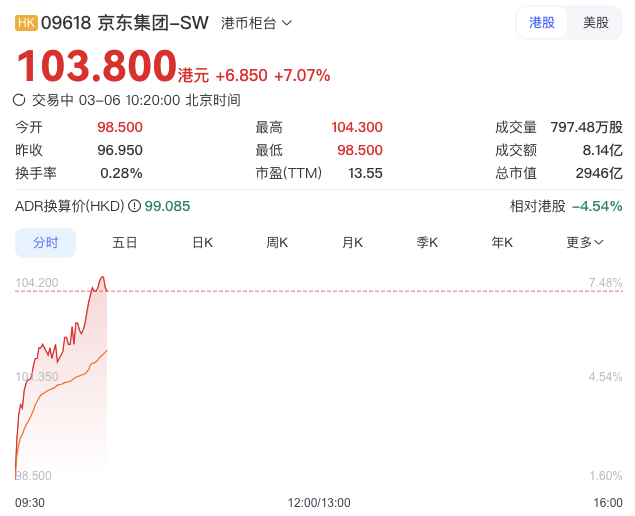 今日港股开盘,京东股价开涨,截至10:20分涨7.07%,报103.8港元/股。
