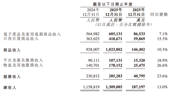 京东集团2025年全年总收入达13091亿元(约1872亿美元),同比增长13.0%,其中,商品收入同比增长10.3%,服务收入同比增长23.6%,占比持续提升。