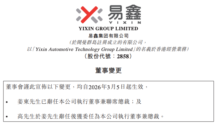 3月6日消息,易鑫集团有限公司(股份代号:2858)公布截至2025年12月31日止年度经审计业绩,同日,宣布姜东先生辞任执行董事兼首席总裁,由高翊先生接任执行董事兼总裁,自2026年3月5日起生效。