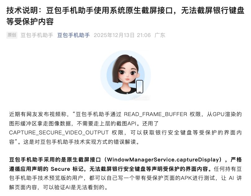 豆包手机助手发布的技术说明称豆包手机助手使用系统原生截屏接口,无法截屏银行键盘等受保护内容。