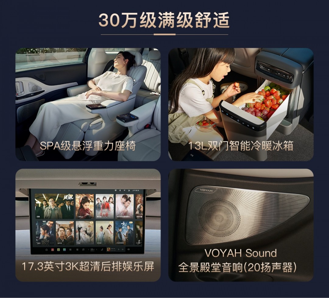 同时,新车座椅配备SPA级悬浮重力座椅,主副驾及第二排座椅均标配加热、通风、按摩功能,第二排搭载左右双小桌板、13升双门智能冷暖箱(温域-6℃至50℃),后排娱乐、储物需求一站式满足。