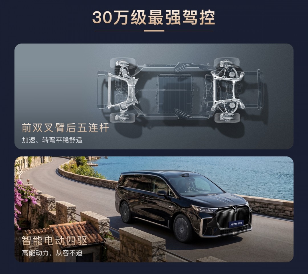 动力搭载1.5T插电混动系统,发动机最大功率150马力,前后双电机总功率310kW;配备41.7kWh三元锂电池,CLTC纯电续航235km,综合续航里程达1411km,彻底打消续航焦虑,长途出行无压力。底盘采用前双叉臂、后五连杆独立悬架,搭配智能电动四驱系统,操控稳定性与乘坐舒适性兼具。