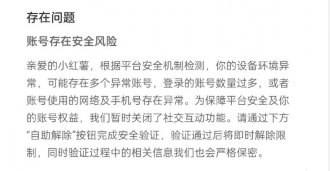 有网友分享,使用龙虾发小红书笔记,结果被封号了。系统提示存在问题为:平台安全机制检测,设备环境异常,可能存在多个异常账号、网络及手机号存在异常,暂时关闭了社交互动功能。