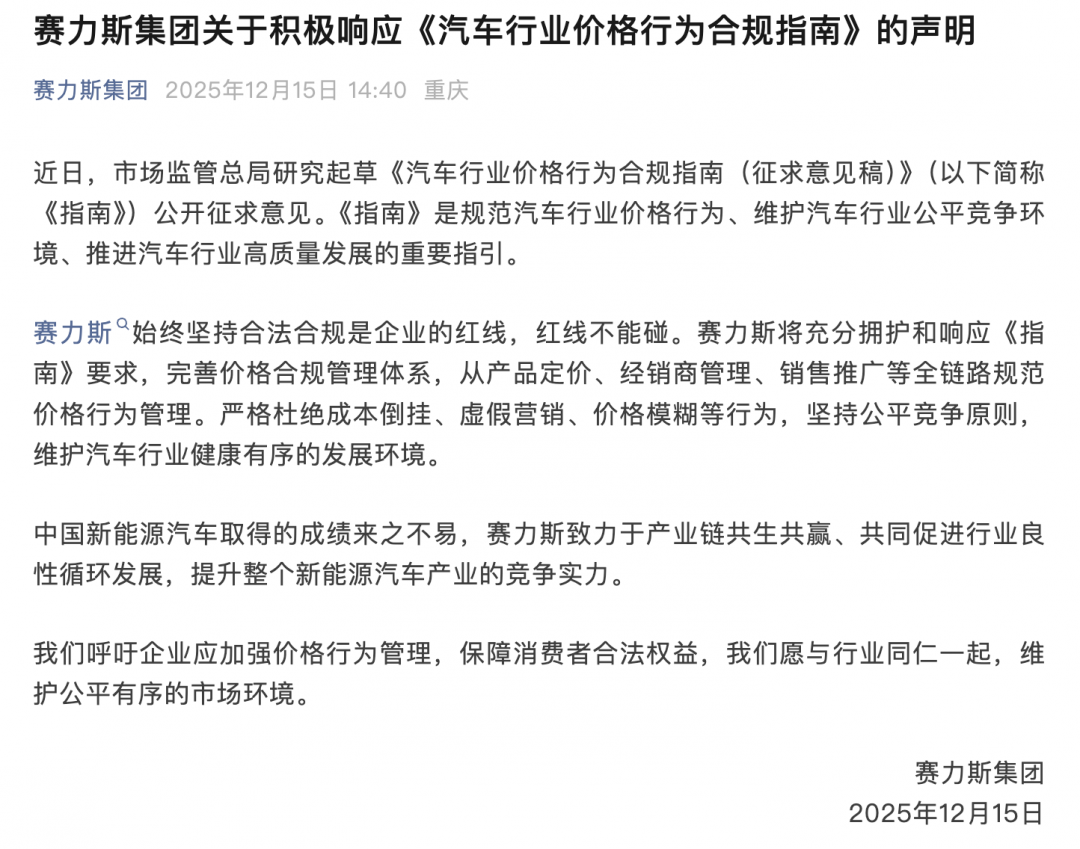 赛力斯集团今日发布关于积极响应《汽车行业价格行为合规指南》的声明,赛力斯在声明中表示,赛力斯始终坚持合法合规是企业的红线,红线不能碰。赛力斯将充分拥护和响应《指南》要求,完善价格合规管理体系,从产品定价、经销商管理、销售推广等全链路规范价格行为管理。严格杜绝成本倒挂、虚假营销、价格模糊等行为,坚持公平竞争原则,维护汽车行业健康有序的发展环境。