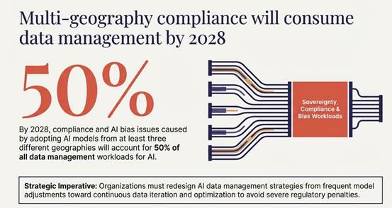 在数据合规方面,Gartner预测到2028年,因采用超过三种以上不同区域的AI模型所产生的数据主权合规及AI偏见问题,将占到AI数据管理量的50%。随着全球AI模型流通加速,中国企业既使用DeepSeek等国产模型出海,也集成海外大模型,数据来源“大杂烩”成为常态。但各国数据法规差异、数据质量参差不齐,使得合规风险急剧上升。金玮指出,企业不能依赖单一厂商,而要从数据生态整体入手,通过数据属地化、虚拟化等技术手段,实现全流程管理。