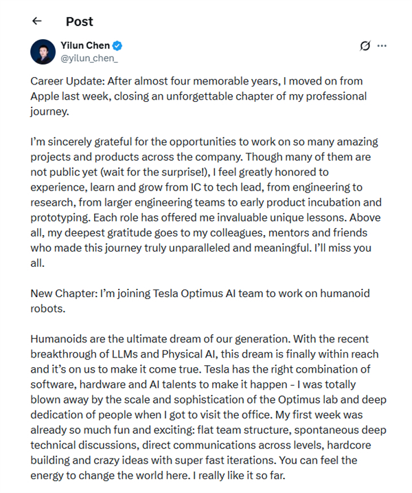 这位名为Yilun Chen的前苹果技术负责人在社交媒体上透露,他选择加入特斯拉主要是因为Optimus项目的规模与技术层次,以及团队展现出的高度专注与专业精神,让他感到震撼。Chen还表示,在入职特斯拉的第一周,团队内部自发而深入的技术讨论、扁平灵活的组织结构以及快速迭代的原型开发流程,都让他感到振奋。