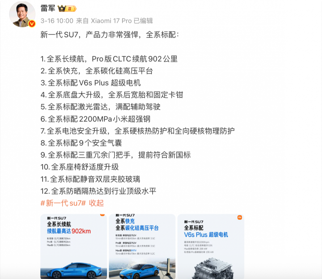 他表示,小米HAD辅助驾驶全新升级XLA认知大模型,新一代SU7全系交付即搭载。