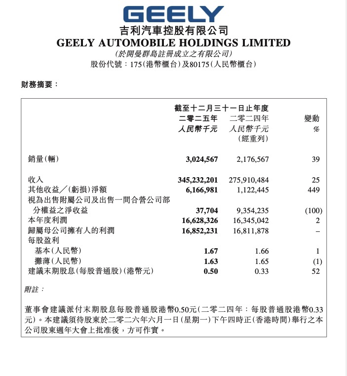 吉利2025年营收破3452亿 新能源销量暴涨九成