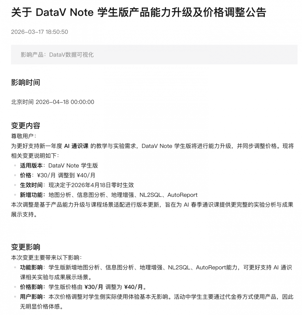 就在前一天,阿里云刚刚上涨了DataV Note 学生版产品的包月价格,从30元/月 调整到 40元/月。