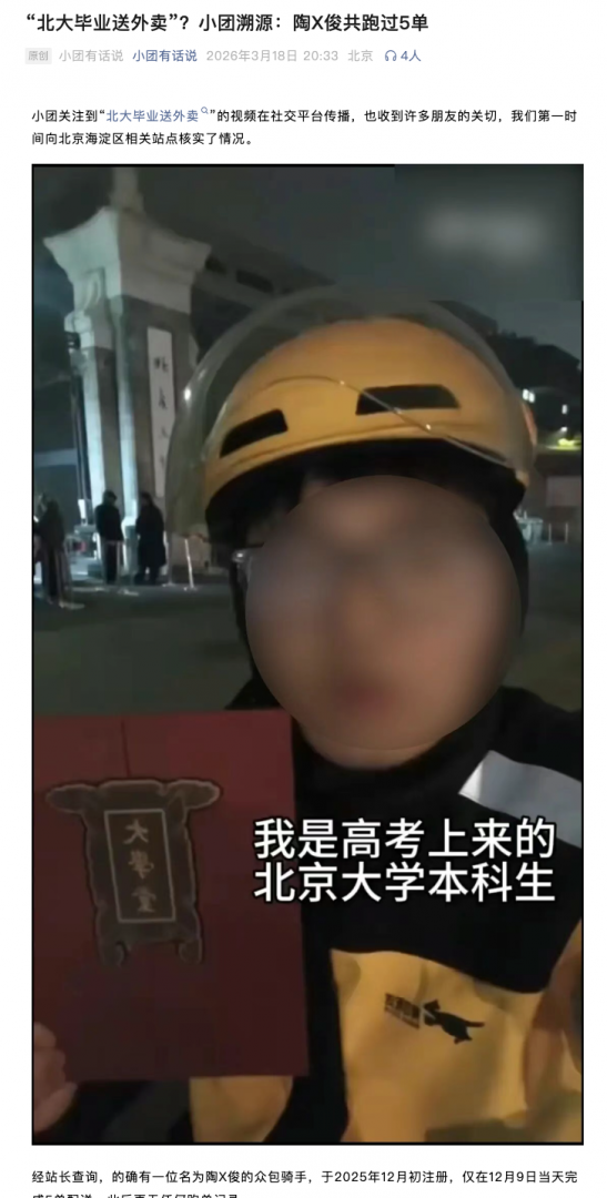 3月19日消息,针对近日热议的“北大毕业送外卖”视频一事,3月18日晚,美团官方账号“小团有话说”发文回应。