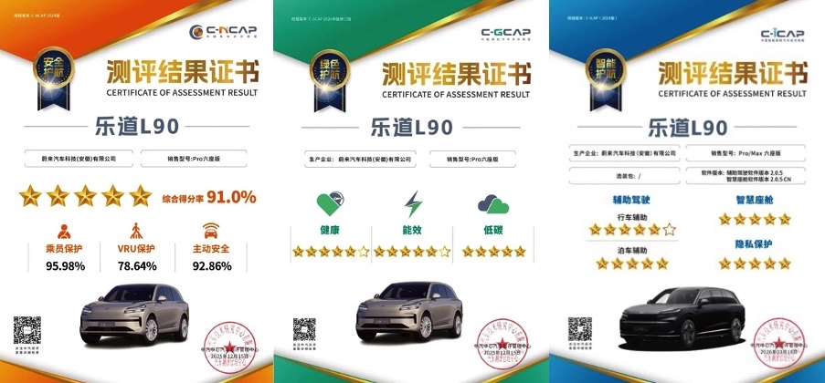 乐道L90获中汽中心三项五星认证 成首个C-NCAP/C-GCAP/C-ICAP大满贯大型SUV