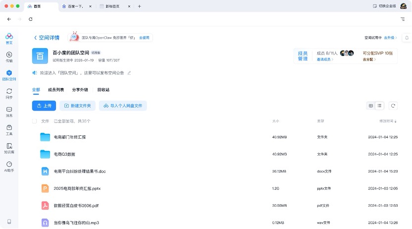 百度网盘重磅推出专为团队设计的「团队空间」功能,打造为组织而生的「智能协作主阵地」。「团队空间」将OpenClaw能力原生嵌入协作全流程,一站式完成存储传输、内外协同、智能生产等工作,文件智能检索、成员评论等操作均支持人与AI一键调用。未来,「团队空间」将支持多Agent自主协同、组织知识沉淀进化、开放能力中枢接入等更多能力。员工将与Agent并肩作战,小团队也将实现生产力的指数级跨越——从「超级个体」迈向「超级组织智能体」。