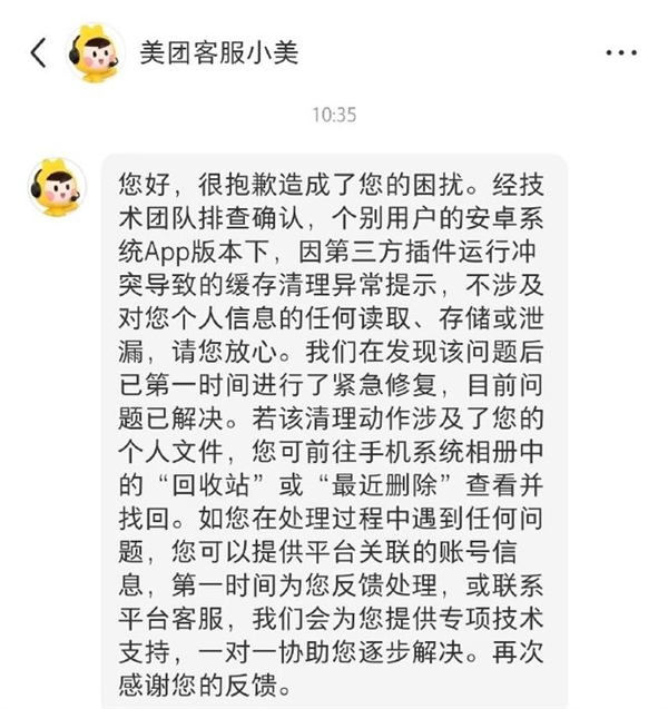 美团方面解释,插件冲突导致App在清理缓存时出现了异常提示,但这并不涉及对用户个人信息的读取、存储或者泄露,目前相关问题已经第一时间得到了修复。
