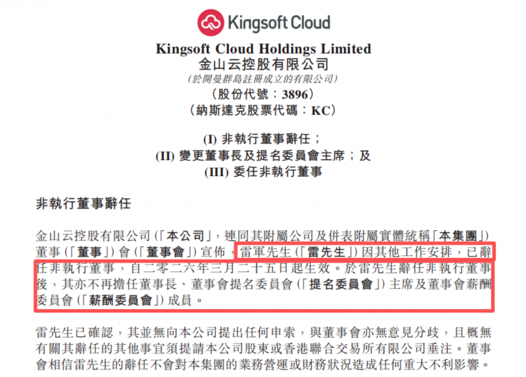 3月26日消息,昨日晚间,金山云控股有限公司(以下简称“金山云”)发布公告称,雷军因其他工作安排,已辞任非执行董事,自3月25日生效,辞任非执行董事后,其亦不再担任董事长、董事会提名委员会主席及董事会薪酬委员会成员。