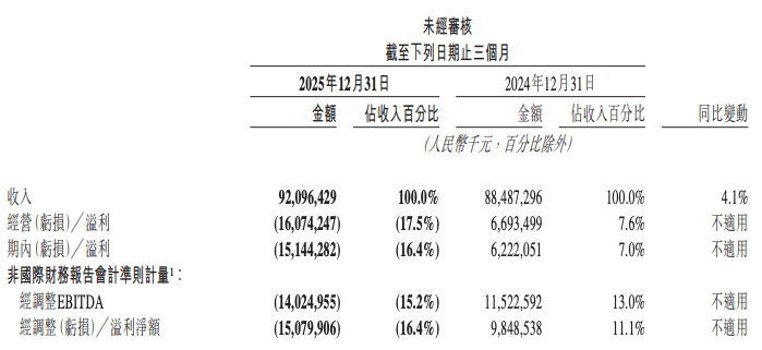 2025年第四季度,美团实现收入921亿元,同比增长4.1%,但经营亏损达161亿元,而2024年同期为经营溢利67亿元。经调整EBITDA为-140亿元,经调整亏损净额为151亿元。