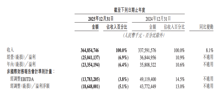 从2025年全年来看,美团实现收入3649亿元,同比增长8.1%,但经营亏损达250亿元,而2024年为经营溢利368亿元;年内净亏损234亿元,2024年为溢利358亿元。经调整EBITDA由2024年的491亿元降至-138亿元。