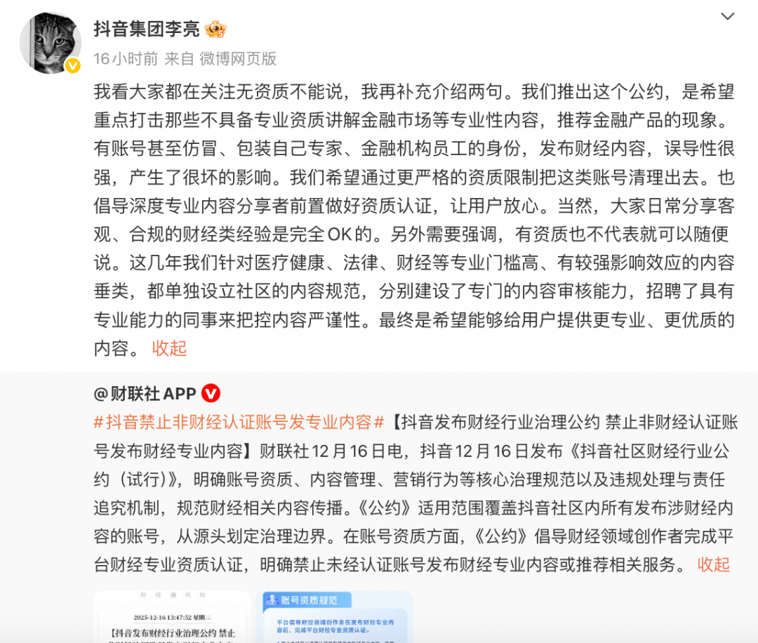 抖音禁止非财经认证账号发财经专业内容 高管回应