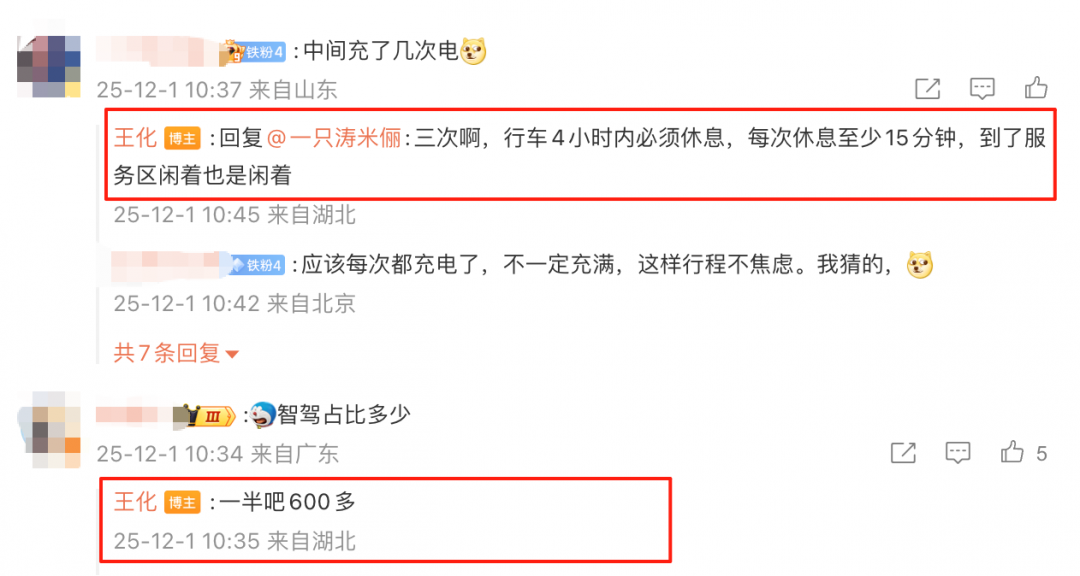 在评论区,王化在回答网友问题时称,一路上充了3次电,智驾占比50%左右。