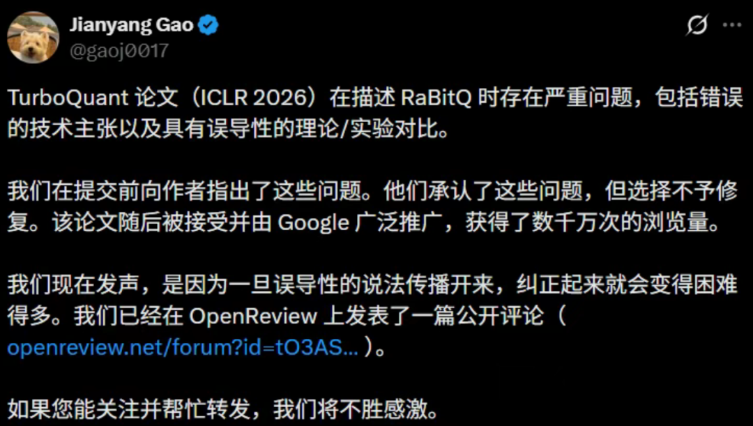 指控内容显示,高健扬是RaBitQ算法的第一作者,该算法早在2024年就已发表,并连续被两大顶会SIGMOD收录,代码完全开源。他直指谷歌的TurboQuant存在三方面严重问题。