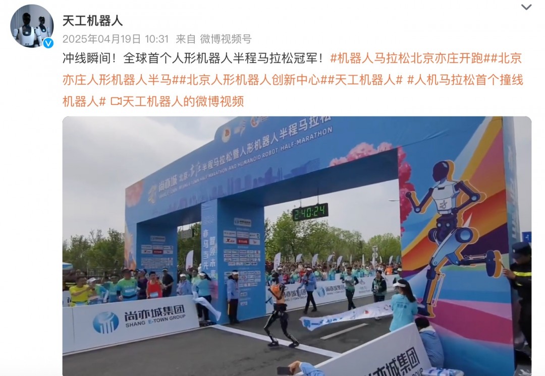 2025年4月,全球首个人形机器人半程马拉松在北京亦庄开跑,现场可谓状况百出,有的机器人开跑即摔倒,有的要中途停下来散热,有的累到“头掉”,20支机器人赛队,仅6台完赛。最终夺冠的天工Ultra机器人用时2小时40分42秒,相当于人类业余跑者的中游水平。