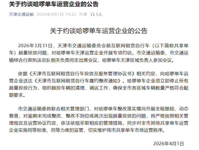 4月1日消息,据天津交通运输公众号消息,天津市交通运输委员会于 2026 年 3 月 31 日就共享单车超量投放问题,对哈啰单车天津运营企业进行了专项约谈。
