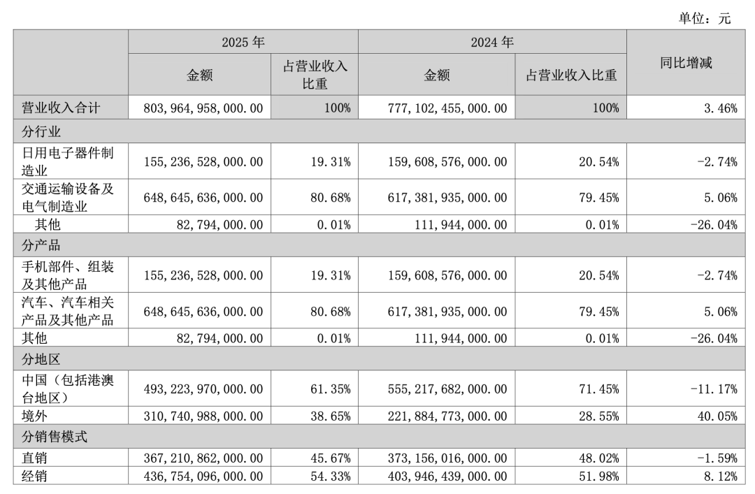 比亚迪的营业收入构成|图片来源:比亚迪 2025 年财报截图