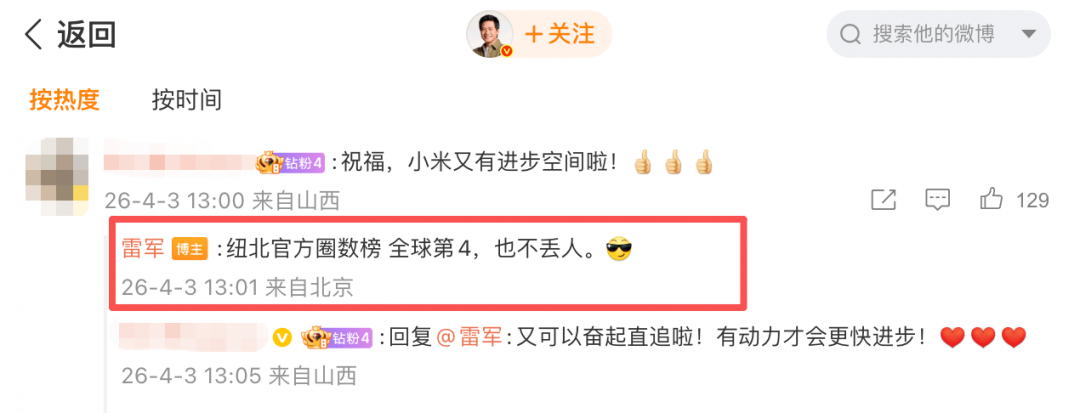 对此,有网友评论称,小米排名下降一名。而小米创始人雷军则大方转发并祝贺福特,他还在评论区表示,“纽北官方圈数榜全球第4,也不丢人。”