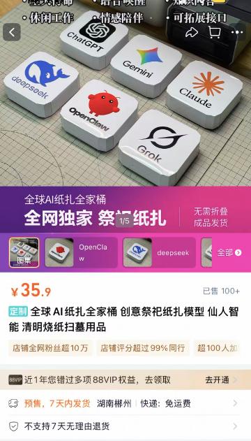 在淘宝平台,一款AI纸扎全家桶,包括DeepSeek、ChatGPT、Gemini、Claude、 OpenClaw的纸扎,售价单个高达35.9元,全家桶6款合计209元。