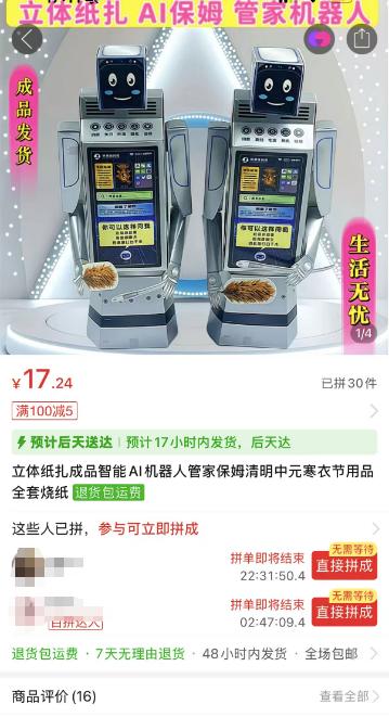 4月4日消息,清明节将至,继前两年纸扎iPhone、折叠屏手机、扫地机器人在祭祀市场走俏之后,今年清明的“赛博祭品”又迎来了一次全面的AI化升级。而这一次,AI大模型和智能机器人成了新晋顶流。