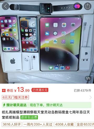 再后来,祭品的种类越来越“内卷”。扫地机器人、VR眼镜、折叠屏手机、无人机等等,这些年年轻人自己都还没买齐全的数码产品,已经被优先“烧”给了祖宗。