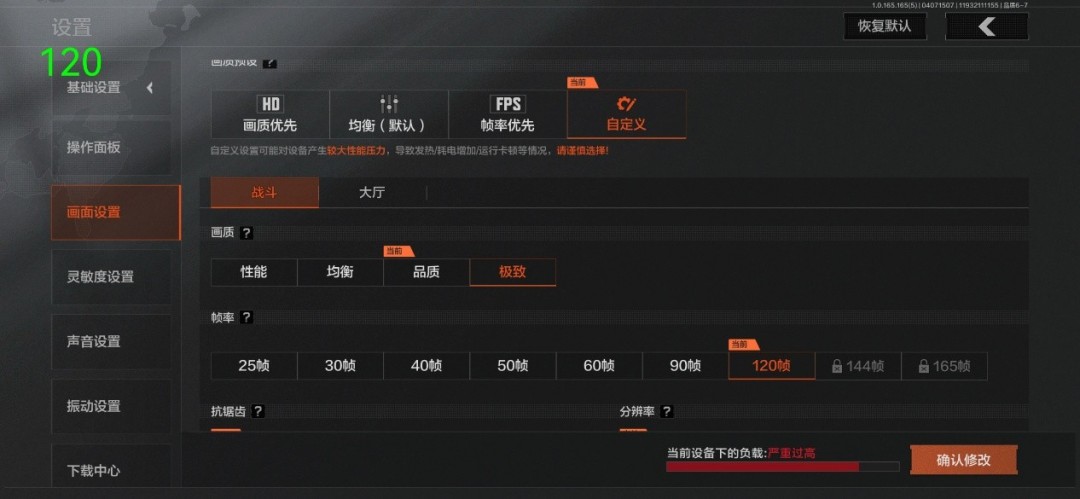 我们先选择了用户基数最大的《王者荣耀》,开启 120 帧满帧 + 最高画质模式连续运行。