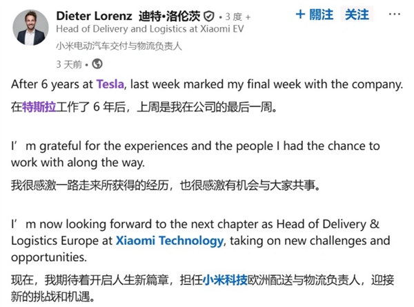 小米汽车的全球化布局再次迎来关键人事落子。近日,小米正式宣布聘请前特斯拉中欧地区交付运营高级经理迪特·洛伦茨,出任小米欧洲交付与物流负责人。洛伦茨在个人社交平台证实了这一消息,在结束特斯拉6年职业生涯后,他将开启新的职业篇章,并重点感谢了老东家。凭借深耕中欧市场多年的运营经验,洛伦茨的加入将为小米在欧洲搭建整车物流与交付体系提供核心支撑。