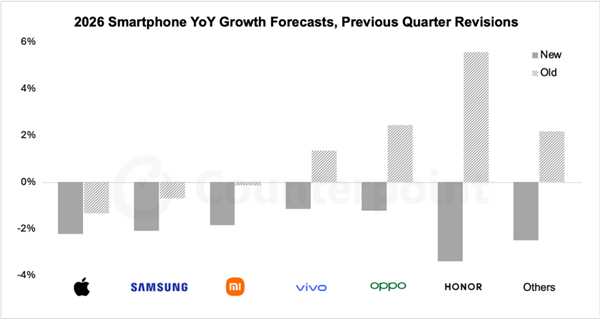 整体来看,几乎所有主要厂商2026年出货均可能同比下滑,不过三星、小米、苹果等头部品牌因规模优势,抗风险能力会更强一些。