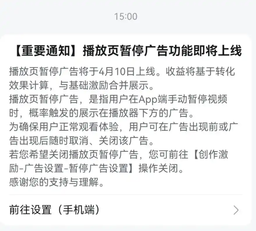 根据通知,播放页暂停广告将于4月10日上线。收益将基于转化效果计算,与基础激励合并展示。