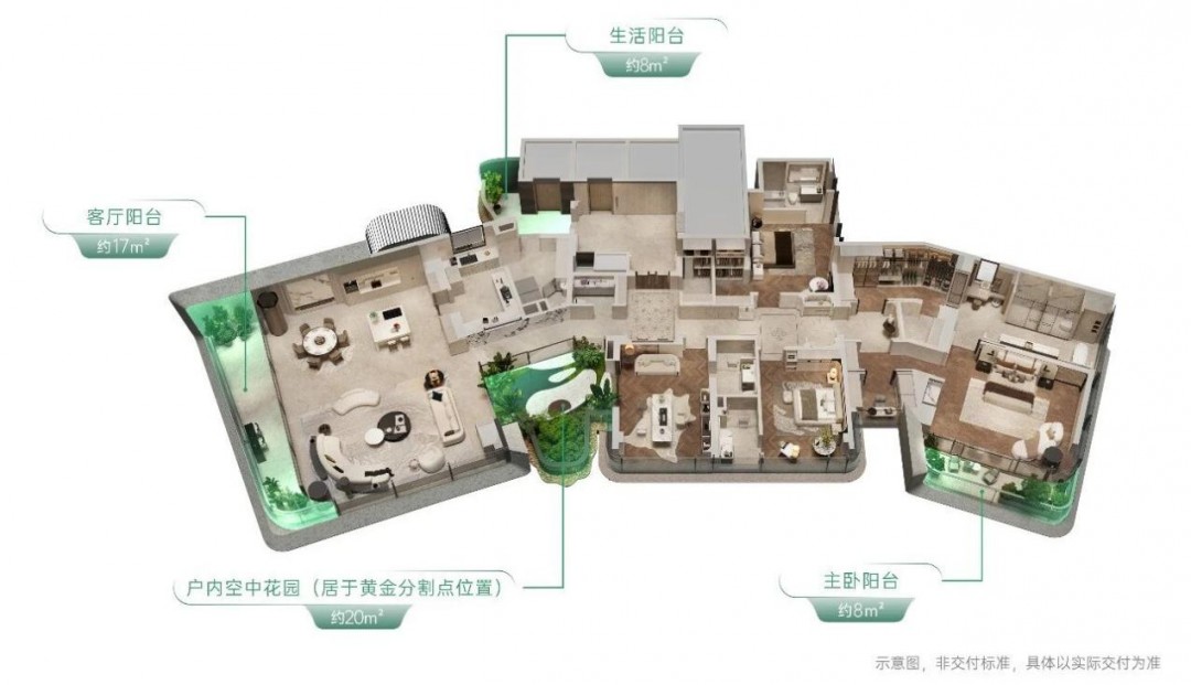 贝宸S1要打造的,是一个“风景里的家”。它打破景观仅存在于地面的传统,通过下沉庭院、全景观架空层、单元大堂立体绿化乃至屋顶第五立面,构建起一个垂直的生态体系。更颠覆的是,它在高层住宅中植入“庭院”概念。以375㎡户型为例,通过“空中四重院”设计,将户内花园、客厅阳台、主卧阳台、生活阳台有机串联,形成四个递进的立体花园场景。约20㎡的户内空中花园,居于户型黄金分割点位,与书房、客厅、厨房相连,成为家的呼吸中心与情感枢纽。