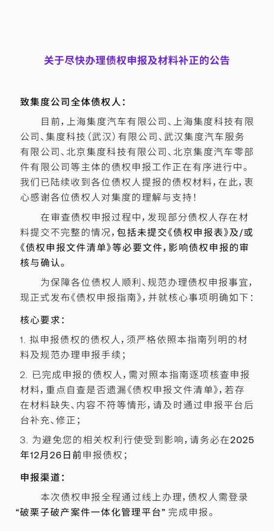 为此,极越汽车正式发布《债权申报指南》,拟申报债权的债权人须严格依照指南列明的材料及规范办理申报手续,申报截止时间为 2025 年 12 月 26 日。