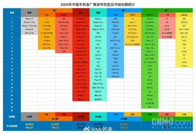 近日,博主“Mr若离”发布了2025年手机厂商市场表现盘点数据。数据显示,去年各大手机厂商在产品布局与市场占有率方面呈现出不同态势:OPPO(含一加、真我)凭借密集的产品线成为